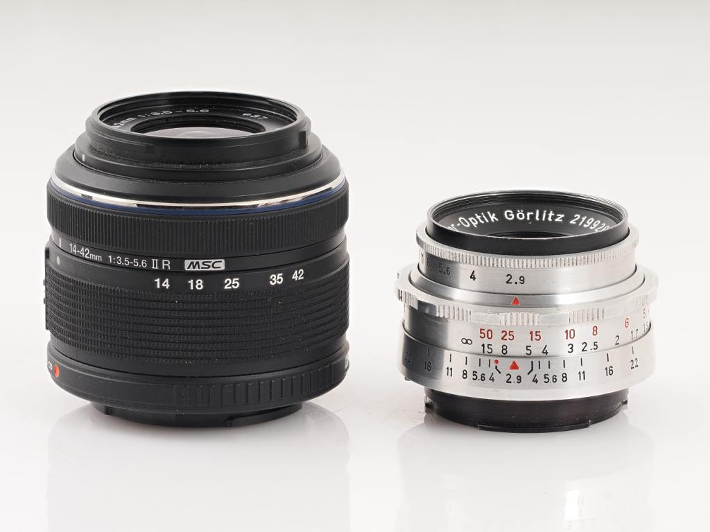 Das 14-42 mFT-Zoom ist gegenüber dem Trioplan gewaltig. Das Trioplan ist kaum größer als ein Pancake. Klar, es ist ein Objektiv ohne Hinterlinse. Und ja, es ist tatsächlich ein 2.9. Die ersten Trioplane waren 3.0. Erst später wurden es dann 2.9. Ein 50mm f/2,8 gab es nur für C-Mount, also für Filmkameras. Als die Triplets dann 2,8 erreichten, wechselten sie den Namen. Die Dinger hießen auf einmal Domiplan.