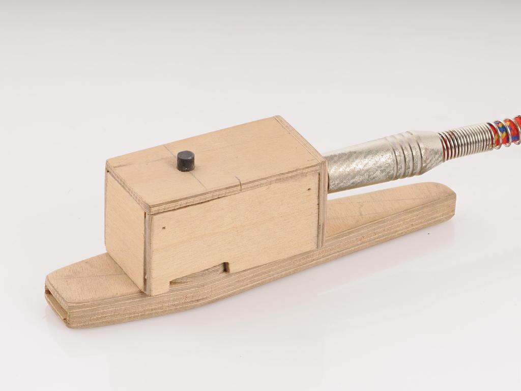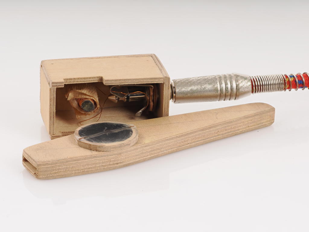 Das ist ein elektrisches Kazoo. Bis gestern abend dachte ich, das sei das Einzige seiner Art auf dieser Welt. Weit gefehlt. Elektrische Kazoos gibt es sogar mit Funkstrecke für unter 40 Euro. AliExpress. Ich dachte, als ich es 1985 zusammengebaut habe, ich hätte da was erfunden. Und zwar habe ich simpel eine metallisierte Membran auf das selbergesägte Holzkazoo geklebt und darauf ein Stück Gitarrensaite. Darüber einen Permamentstabmagneten, um den ich mal ein paar Hundert Wicklungen CuL-Draht praktiziert habe. Klinkenbuchse dran, fertig. Hat einen sagenhaft präsenten Sound. Viel besser als die billigen Metall- und Plastikkazoos, bei denen immer das Gehäuse mitscheppert.