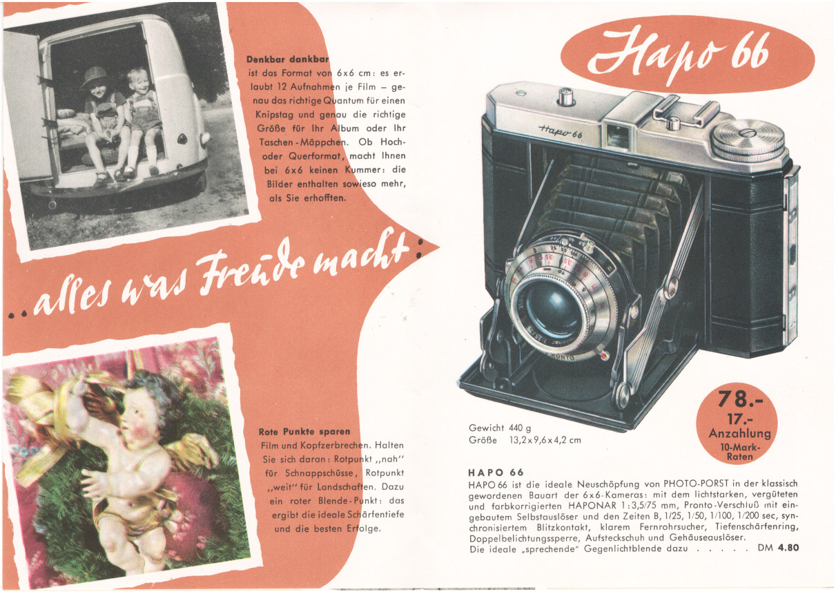 Mit der Hapo 66 von Photo Port habe ich das Fotografieren gelernt. Sogar spitzwinklige Bilder von fahrenden Zügen sind mir gelungen. Der „Fernrohrsucher“ war eher mäßig, links fehlte dann oft mal was im Bild. Und die „sprechende Sonnenblende“ war entweder weg oder blieb in so einem runden ledernen Behälter, der an der ledernen Schutztasche der Kamera hing, die von unten im Stativgewinde festgeschraubt wurde. 78 Mark muss damals gut ein halber Wochenlohn gewesen sein. Die Rollfilmnegative habe ich noch.