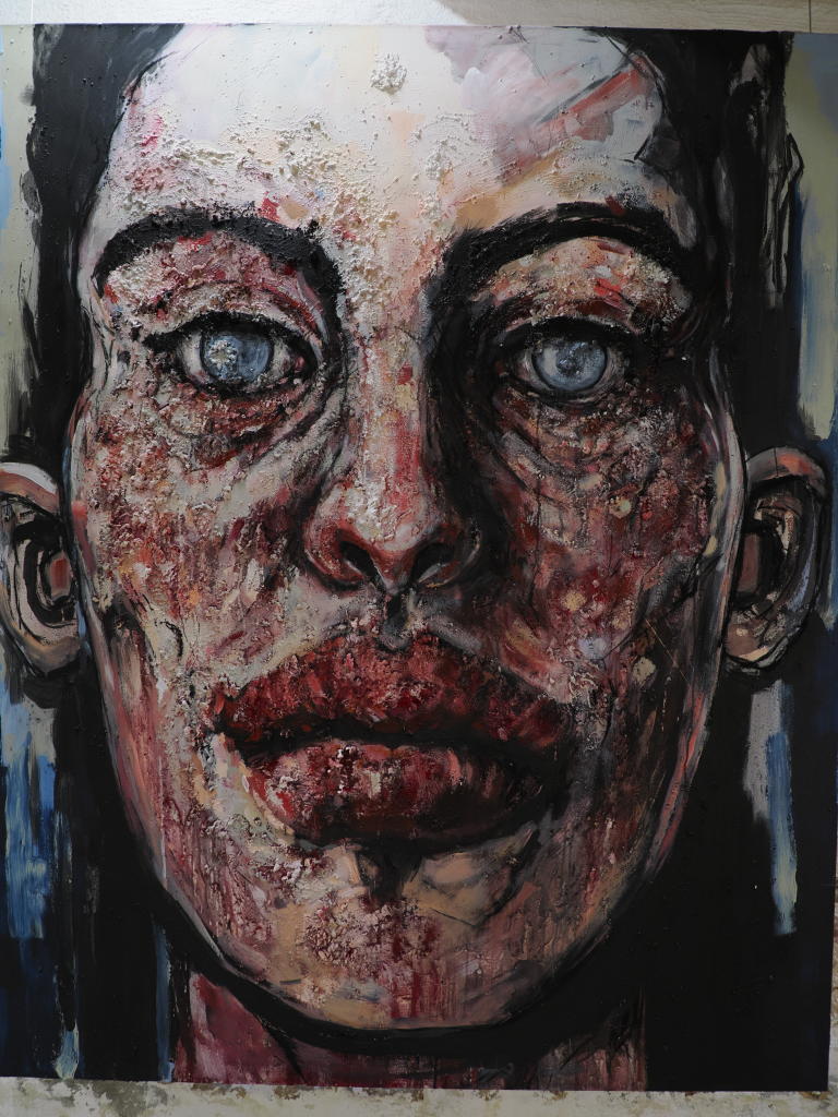 Gut raumfüllend. zwofuffzich hoch etwa. Mischtechnik. Was fällt auf? Winzige Ohren. Überdimensionale Lippen, kleine Stirn. Und ja, natürlich die Farbe und die schorfähnlichen Strukturen. Das Bild wirkt extrem intensiv – und zwar nicht nur im Originalformat, sondern auch hier. Der Grund: es ist aus einer Entfernung aufgenommen, aus der man ein solches Gesicht mit dem Bildwinkel des normalen Auges gar nicht erfassen kann und diese Entfernung ist weit unterhalb der „Wohlfühlentfernung“. Man kommt einem Gesicht also nur in einem sehr intimen Moment so nahe – und dann sieht man es nicht so.