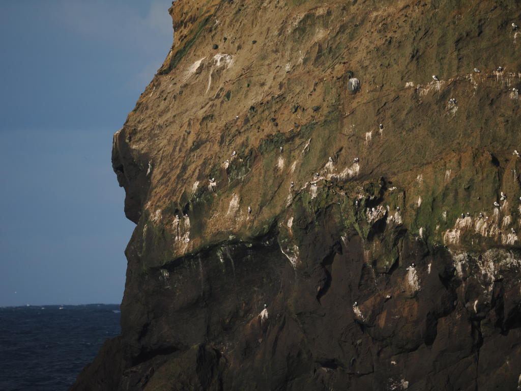 Die Insel ist ein alter Vulkanschlot und entstand vor knapp 900 Jahren. Und ist von der Aufnahmeposition 14,3km weg. Aus einer Entfernung von über 14 Kilometern noch den Schnabel eines Basstölpels zu fotografieren ist schon nicht sooo schlecht. Schönen Gruß an die Birder: Ja, es gab auch fliegende und welche, die waren näher dran, denn das ist angeblich eine der weltgrößten Basstölpelkolonien. Dann kannste Tölpel knipsen, bis die Speicherkarte glüht. Aber selbst bei klarem Wetter sind 14km einfach zu viel Luft, als dass man noch wirklich kleinste Details abbilden kann, egal welche Linse man drauf hat.