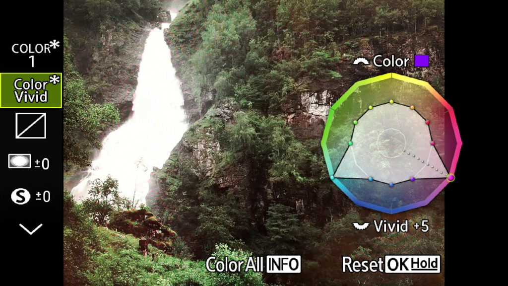 Ansonsten sind die Filter der digitalen Farbkreise aber durchaus ähnlich einem tatsächlichen Farbfilter. Es wird genau der ausgewählte Bereich und die unmittelbar anschließenden beiden Bereiche verstärkt, der Rest je nach Einstellung reduziert. Das funktioniert auch im „COLOR“-Modus.