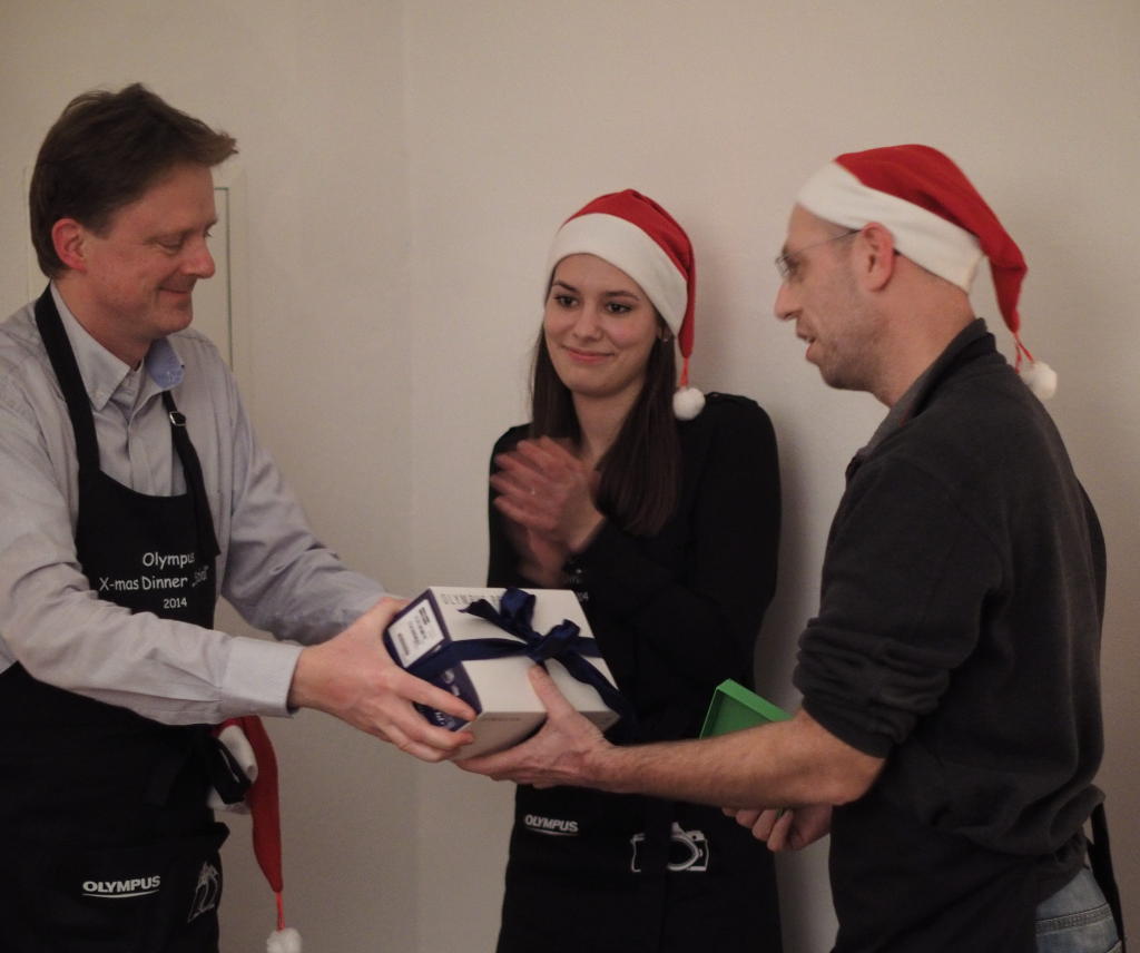 Und hier noch mal Herr Kreuter als Koch auf einem Olympus-Weihnachtspressedinner. Er übergibt gerade eine Kamera an einen Journalisten. Beifall aus dem Hintergrund. (Und ja, ich habe auch so eine Schürze, sogar zwei, weil einer von den Kollegen die Schürze nicht haben wollte – ich bin da nicht so pingelig.)