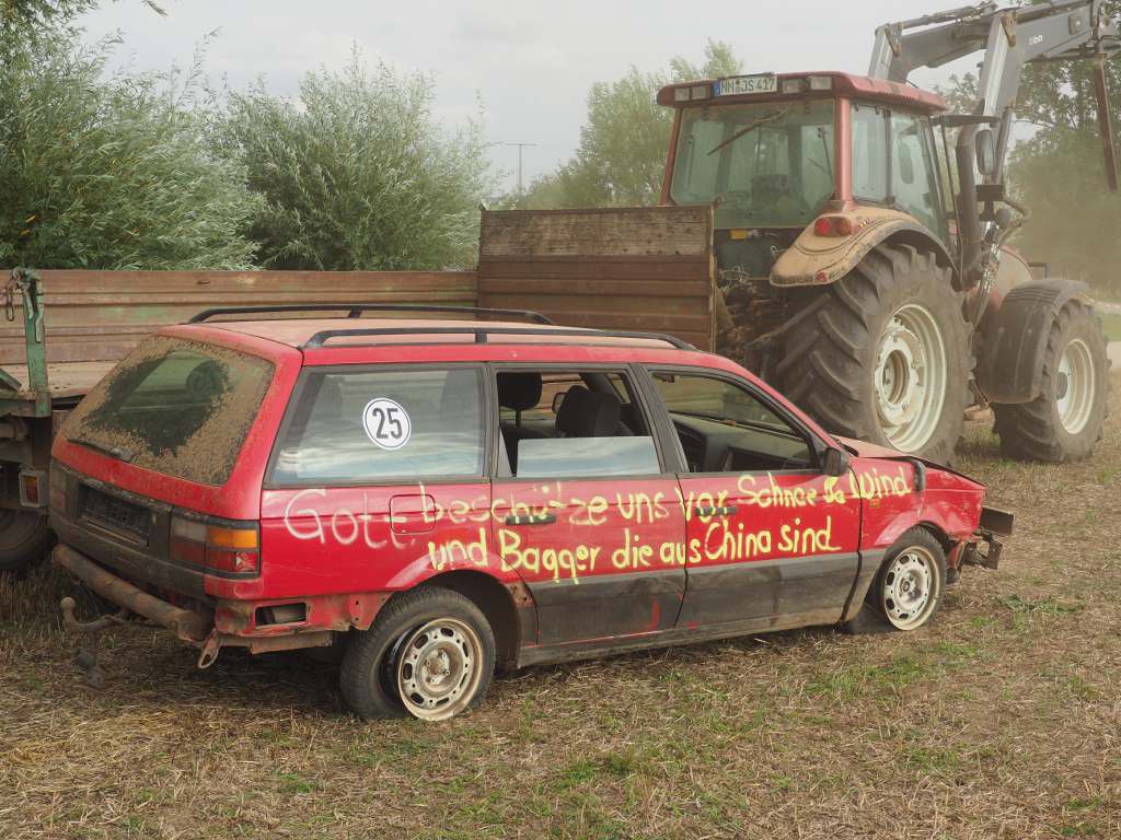 Das Titelbild hat mit dem Thema nichts zu tun. Es stammt vom Stoppelfeldrennen von vor ein paar Jahren aus Wettenhofen. Das Geschoss gehört einer Frau, die a) die Reifen von der Felge gefahren hat und b) anschließend die Kiste mit dem Gabelstapler auf den Hänger geladen hat.